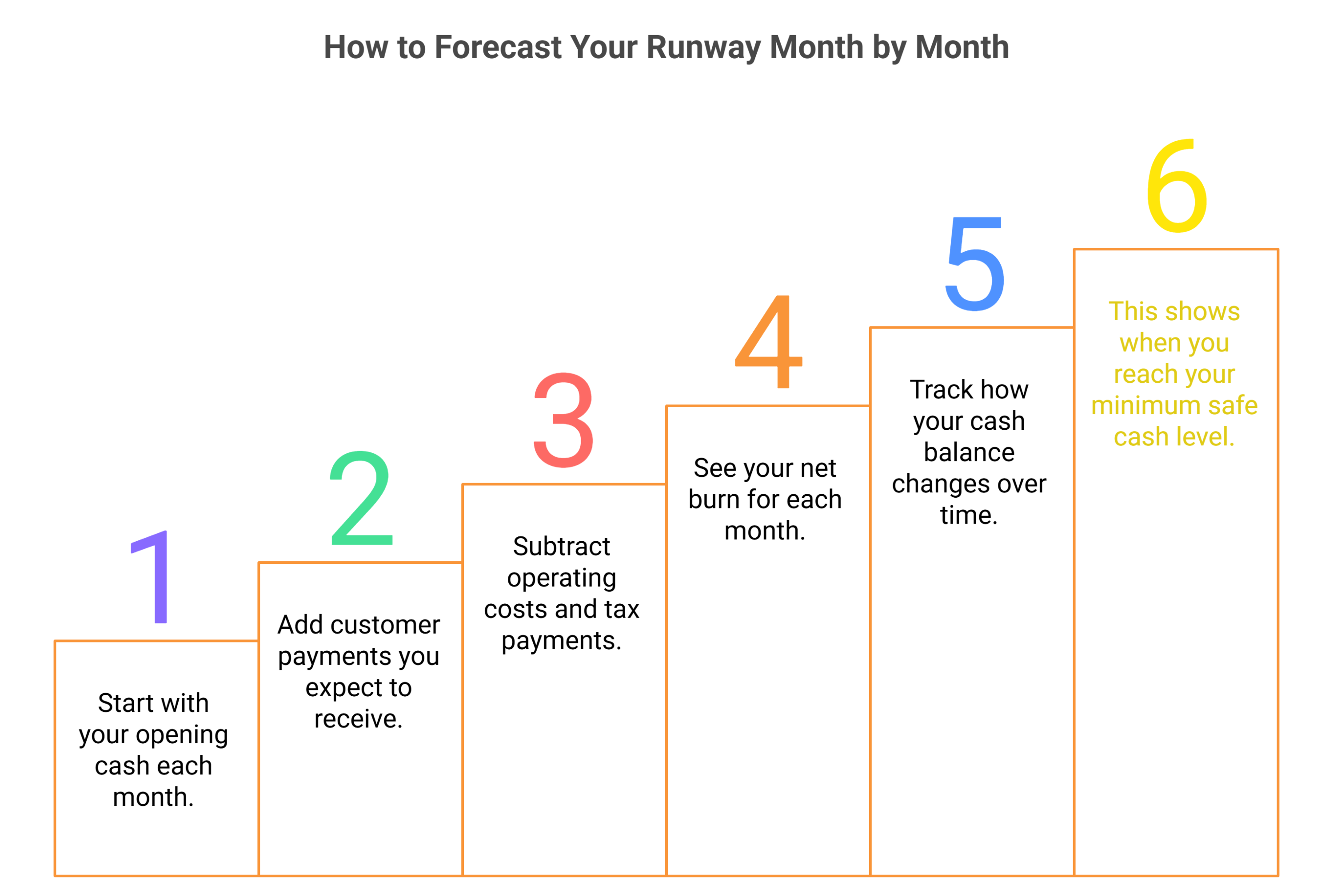 Define runway as the number of months until cash reaches your minimum operating buffer.